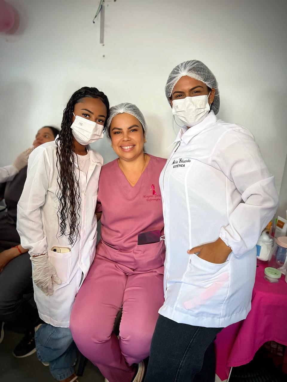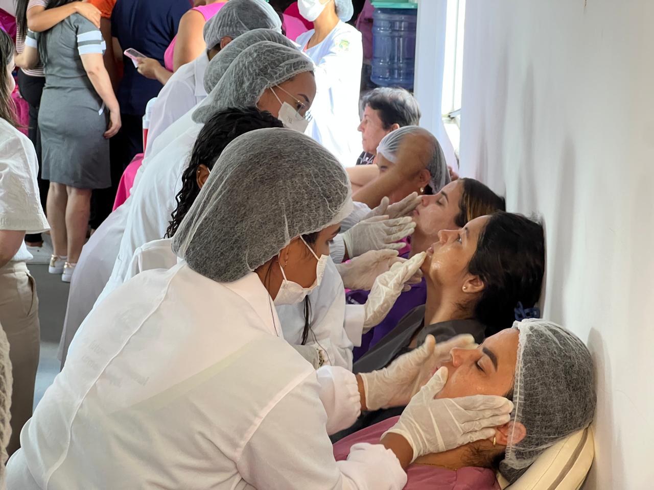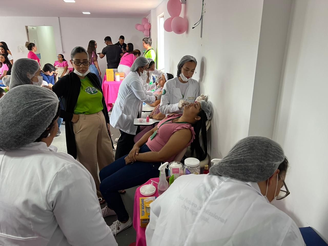 Durante a ação, foram realizadas limpezas de pele e orientações sobre saúde e autoestima, reforçando a importância da prevenção e do diagnóstico precoce do câncer de mama.